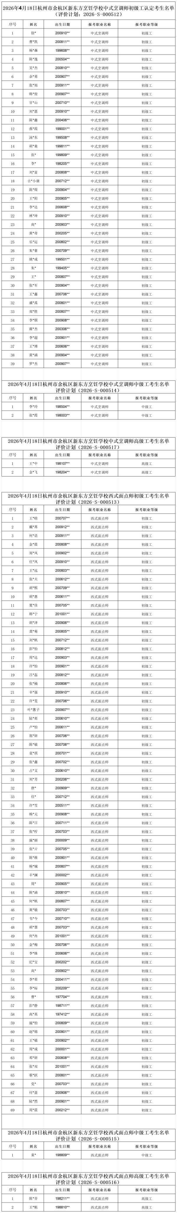 余杭區(qū)新東方烹飪學(xué)校2026年4月18日批次認定花名冊 我校于2026年4月18日開展中式烹調(diào)師和西式面點師初級、中級、高級的職業(yè)技能等級認定,考生花名冊如下,現(xiàn)予以公示。 公示期為:2026年3月24日——2026年3月30日 上一篇:活成同行羨慕的樣子—他的二三十萬年薪,藏在扎實功底里 下一篇:樓外樓廚師長走進杭州新東方,手把手傳授西湖醋魚絕技