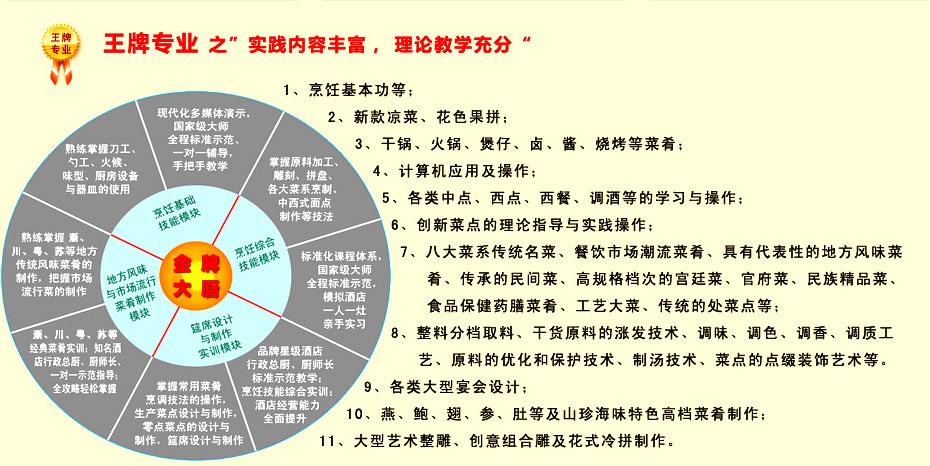 理論部分 主修:《烹調(diào)工藝》、《烹飪營養(yǎng)與衛(wèi)生》、《烹飪概論》、《烹飪原料學(xué)》、《餐飲管理》、《中西點(diǎn)基礎(chǔ)知識(shí)》、《成功秘籍(職素)》、《就業(yè)寶典(職素)》。