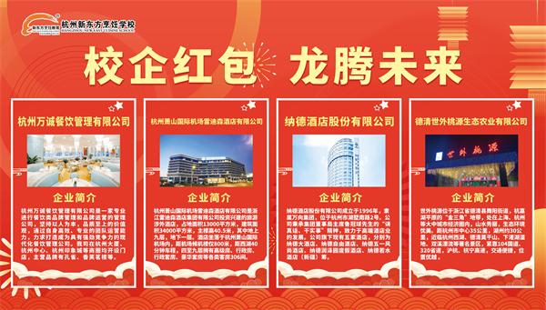今年,杭州新東方職業(yè)學(xué)校不僅以其專業(yè)的教學(xué)質(zhì)量和良好的就業(yè)前景吸引了眾多新生,更與杭州萬誠餐飲管理有限公司、杭州蕭山國際機場雷迪森酒店有限公司、納德酒店股份有限公司、德清世外桃源生態(tài)農(nóng)業(yè)有限公司四家企業(yè)強強聯(lián)手,共同為新入學(xué)的學(xué)子們送上了一份特別的新春祝福——新春紅包。