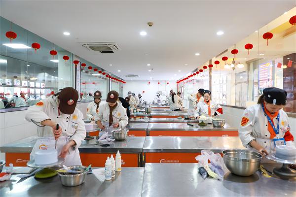 考核現(xiàn)場,氣氛緊張而有序。同學(xué)們身穿整潔的服裝,面帶專注的神情,一絲不茍地投入到創(chuàng)作中。他們手中的刮刀猶如畫家的畫筆,或輕盈或有力,在蛋糕胚上勾勒出一幅幅精美的圖案。