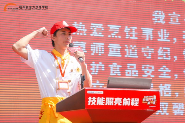 全體新生以集體宣誓的方式,宣告對(duì)烹飪事業(yè)的堅(jiān)守。“熱愛(ài)烹飪事業(yè),弘揚(yáng)飲食文化;尊師重道守紀(jì),恪守誠(chéng)信公德;維護(hù)食品安全,倡導(dǎo)勤儉節(jié)約;立品格,練技能,為做一名德藝雙馨的廚師而奮斗!”