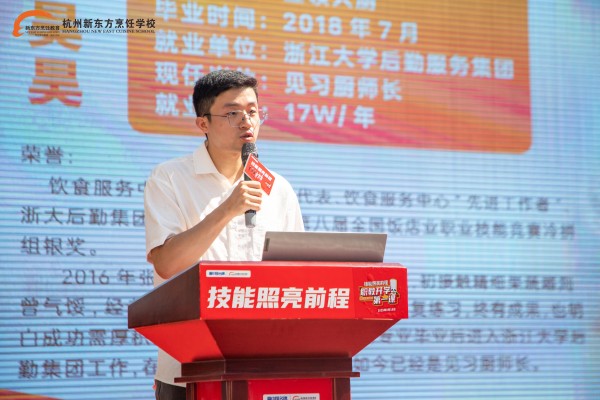 本次活動(dòng),已經(jīng)畢業(yè)的學(xué)長(zhǎng)張昊昊也來(lái)到了活動(dòng)現(xiàn)場(chǎng),現(xiàn)任浙江大學(xué)后勤食堂見(jiàn)習(xí)廚師長(zhǎng)的他,回顧了自己在杭州新東方的學(xué)習(xí)時(shí)光,分享了從烹飪新手到獨(dú)當(dāng)一面的成長(zhǎng)故事。他告訴同學(xué)們,選擇杭州新東方,就是選擇擁抱烹飪藝術(shù)、錘煉匠心、開(kāi)啟無(wú)限可能的未來(lái),希望大家以歸零心態(tài)、勇于嘗試的精神和對(duì)烹飪的熱愛(ài),在校園里收獲成長(zhǎng)。